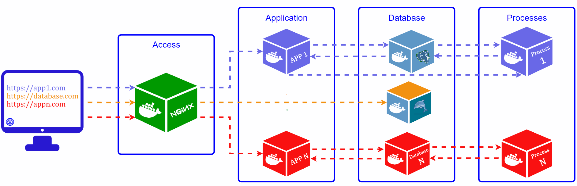 Access: Responsible for managing access to containers. This is the only server that has external access rules, all security rules and redirections for access to other applications are defined on it. For my applications, I use the NGNIX reverse proxy.