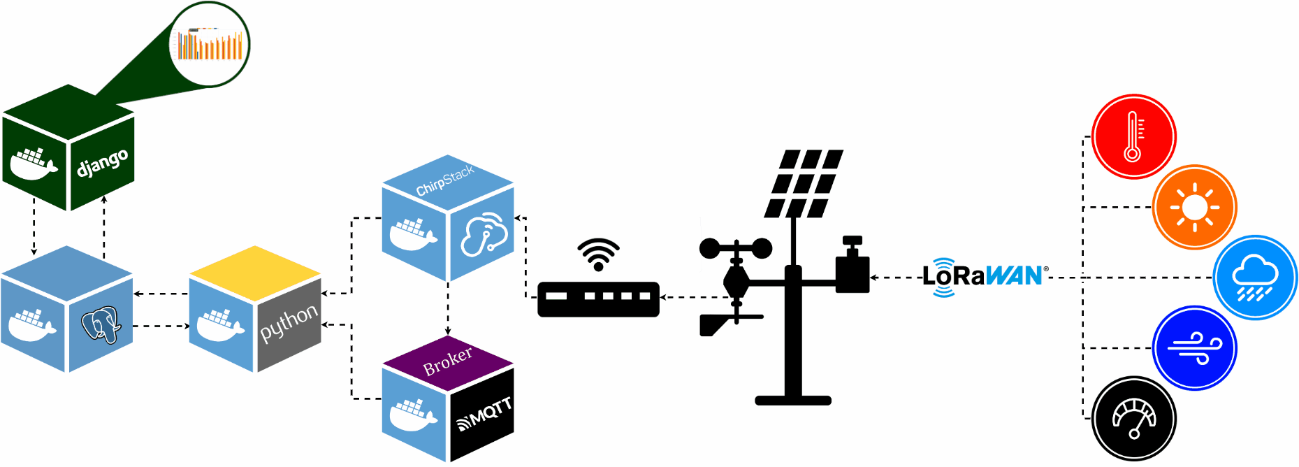 In this project, a way of collecting data from environmental sensors was created, requiring the creation of the entire system between the sensor and the dashboard to visualize the data. The data comes from a commercial sensor that collects data on wind, temperature, atmospheric pressure, rain and solar radiation. Sensors send data to a station using the LoRaWAN protocol. The station, in turn, sends the information to a gateway. To access the data and configure the gateway, the Chirpstack server is used, and each sensor needs to be configured to send information to the configured gateway. The server offers an API, but it is possible to redirect the data to an MQTT broker. Finally, the data is sent to a database connected to a web interface developed in Django.
